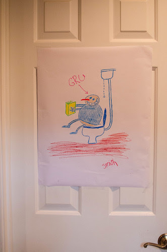 Perhaps my favorite detail of the party however, was this sign. This scene from the movie has become a source of constant entertainment in our house, with one of us just randomly saying "I sit on the toilet," and all of us dissolving into laughter. If I had to choose, I would say this is my favorite scene of the movie. Once again, Joey was responsible for this decoration. We actually hung this on the bathroom door, which really upset Caroline - she wanted it in the dining room with the rest of the plans.